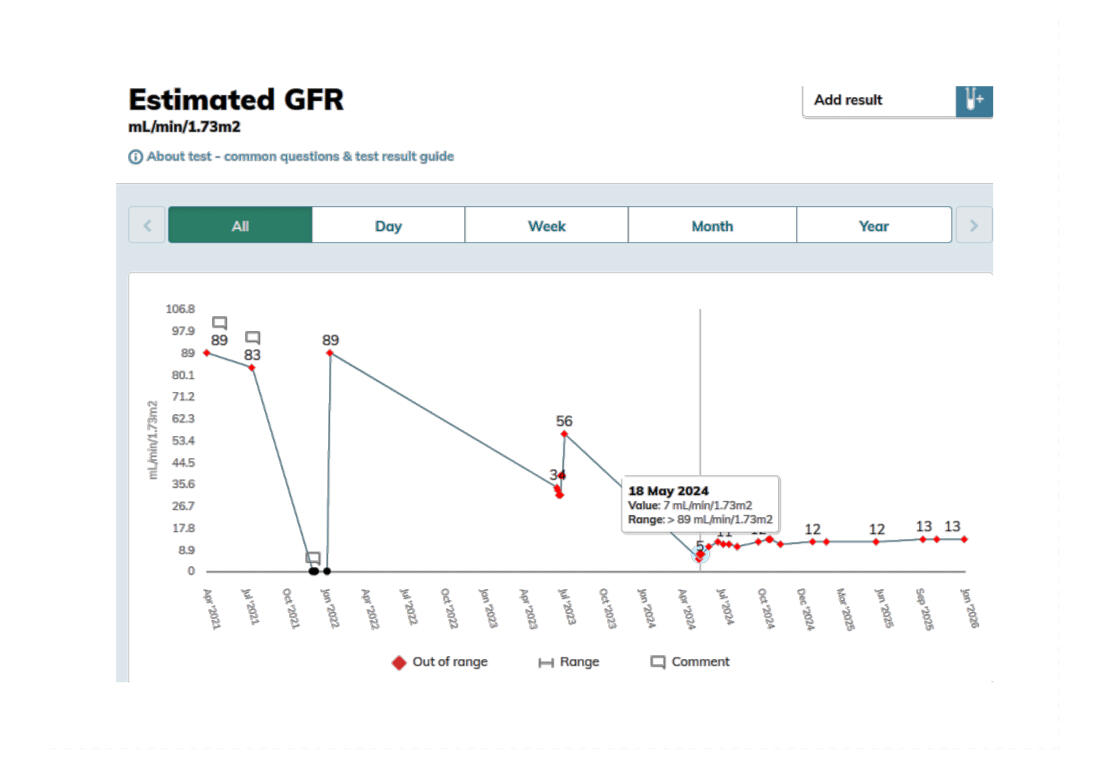 Twelve years ago, I was diagnosed with rectal cancer. I made a choice then: it would not defeat me. I fought, and I won. But victory was bittersweet. There was collateral damage from a surgery to my bladder and urinary tract. Not only that, but the biopsy showed that there was no longer any cancer, and that the operation was unnecessary.My bladder never fully recovered. In 2021, under the crushing weight of work stress, I went 48 days without eating while still working full-time. I lost 25 kg in weight; my body began to buckle. While in the hospital, I got a bladder infection that remained untreated. My bladder continued to deteriorate after that until May 2024, when my kidney function plummeted to just 5%. That is an eGFR of 5. Look at the chart above for the stages of kidney failure.