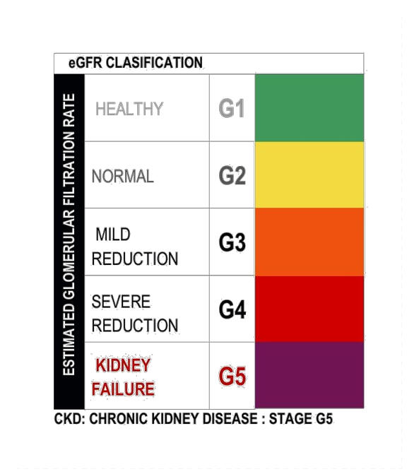 The chart shows the stages that lead to kidney failure. This is measured in a blood test. An eGFR of 60-90 shows good to reasonable health, as shown in G1 and G2. Stage G5 shows an eGFR of 15 or lower, which means permanent kidney damage. My eGFR is currently 13. In essence, it means I have 13% kidney function left.